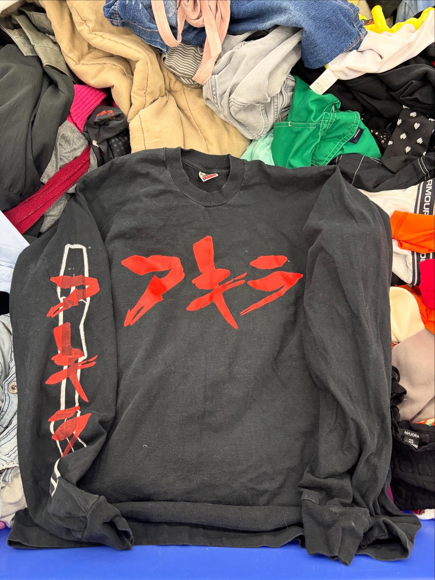 Then I saw a faded black sleeve sticking out from under a heavy wool blanket. I pulled it free and realized exactly what I was holding before I even saw the full front graphic: the Akira long sleeve. It was perfectly worn in, and when I checked the neck, the Fashion Victim tag was still there. I honestly couldn't believe it was just sitting there unpicked. I tossed it into my cart, trying to keep a straight face, and buried it under a pile of Wranglers just to be safe.