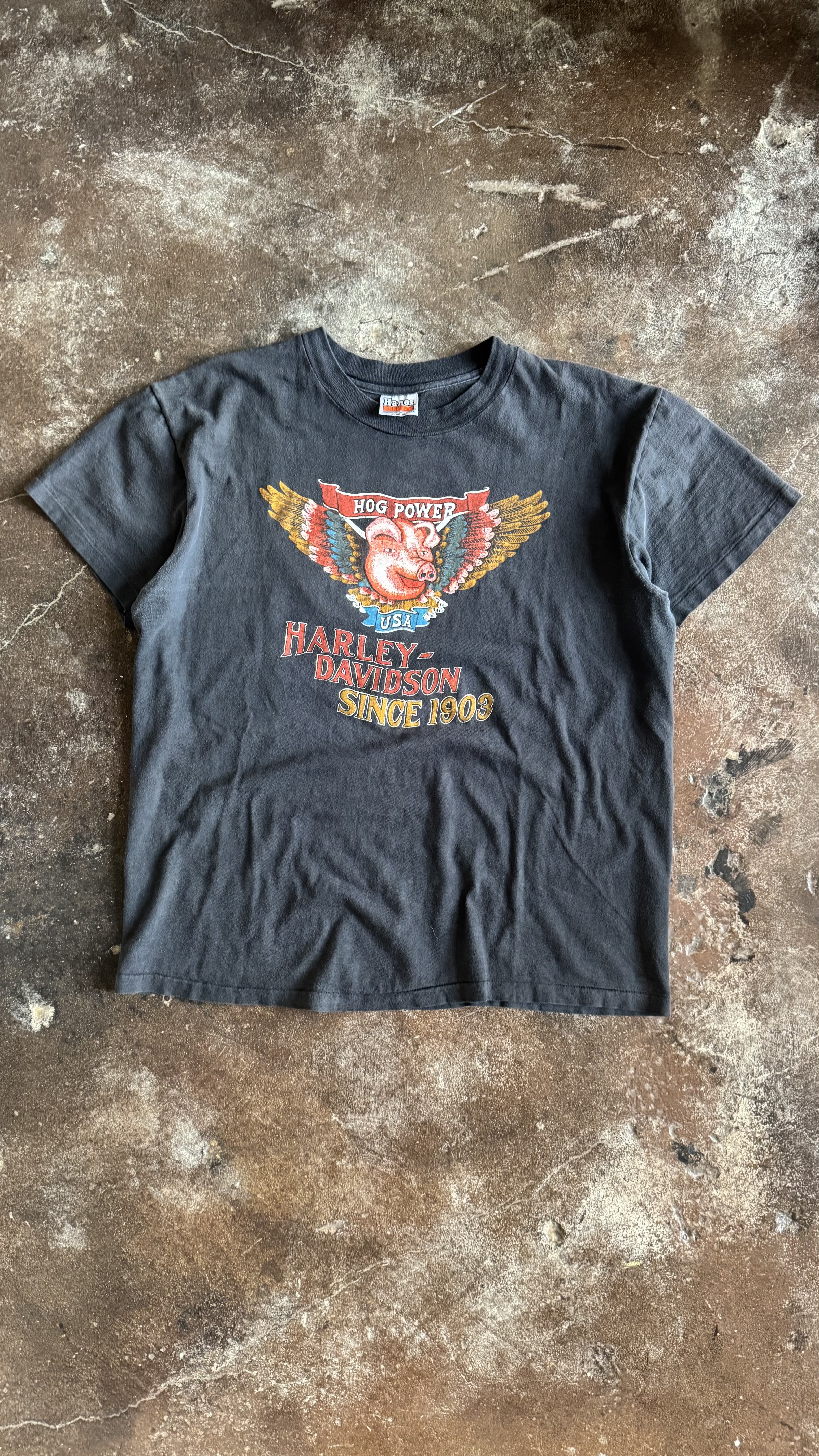 "Hog Power" is a vintage t-shirt design, likely produced by R.K. Stratman Inc. or a similar authorized licensee for Harley-Davidson dealerships in the mid-1980s. Unlike the hyper-realistic, aggressive imagery of the "Real Steel" era, this design leans into the humorous and communal side of biker culture, celebrating the adoption of the "Hog" nickname by Harley enthusiasts.