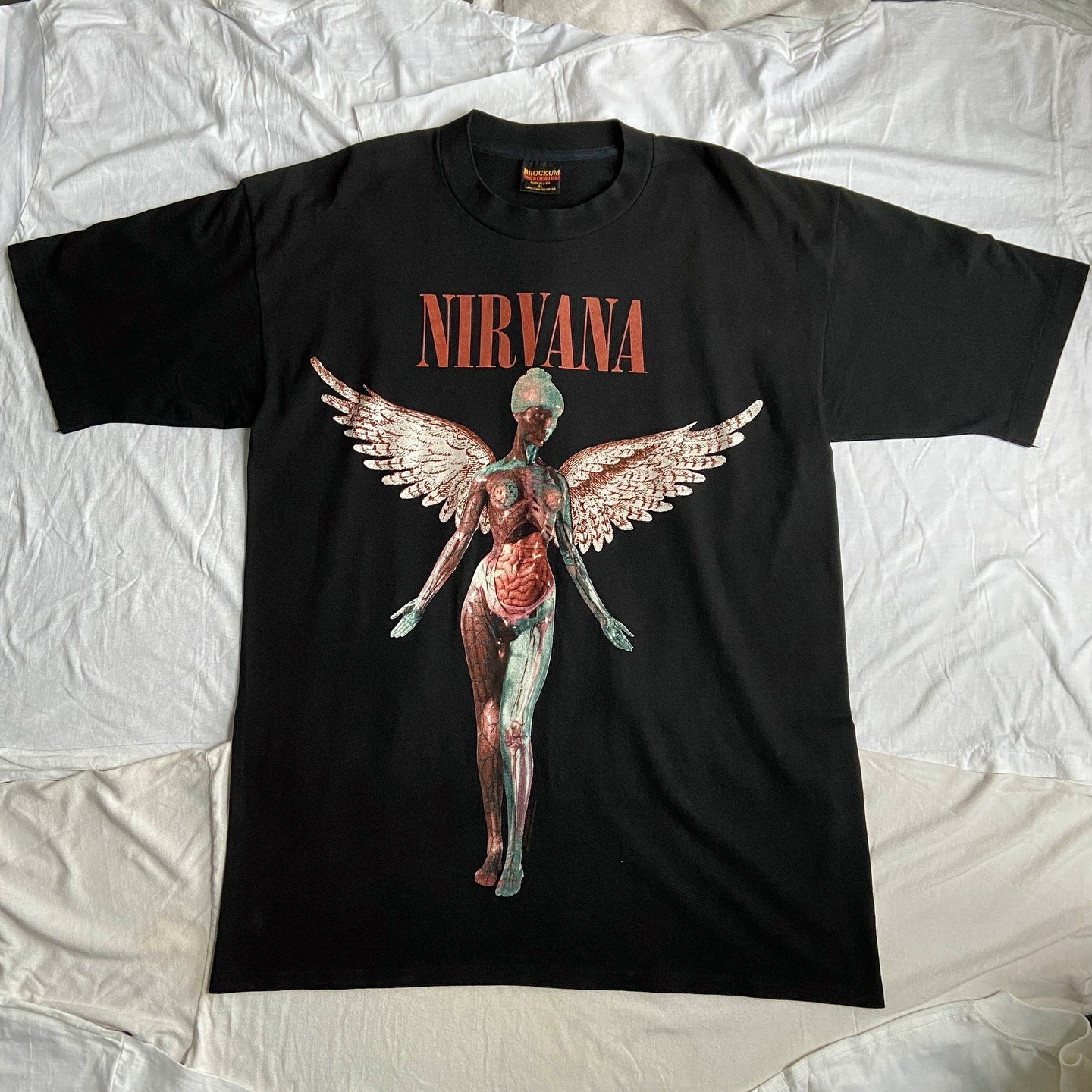 The Nirvana "In Utero" Anatomical Angel T-shirt (Black Variant) is an exceptionally rare pre-production sample produced in 1993 during the promotional cycle for Nirvana's third studio album, In Utero. Unlike the widely distributed white version of the design, which was sold commercially in retail stores and at concert venues, the black variant was never authorized for general public sale. Instead, it was manufactured in strictly limited quantities by merchandising licensee Brockum Worldwide to serve as a promotional gift exclusively for the band’s inner circle, including personal friends, family members, and the touring road crew. The design features the iconic Transparent Anatomical Manikin (TAM) with angel wings, a visual concept curated by Kurt Cobain, set against a black heavyweight cotton canvas that distinguished it from the standard consumer merchandise. Due to its restricted non-commercial distribution, the black "In Utero" sample is considered one of the most elusive artifacts in grunge history. Authentic examples are identified by the period-correct Brockum Worldwide neck tag and the "© 1993 NIRVANA" licensing text, which differs in availability from the mass-marketed white counterparts. Because these shirts were gifted directly to those closest to the band rather than sold, very few legitimate specimens entered circulation, and they are typically only discovered when sourced directly from former crew members or industry insiders. This exclusivity has elevated the black variant to "holy grail" status within the vintage community, representing a personal connection to the band that standard tour merchandise does not.